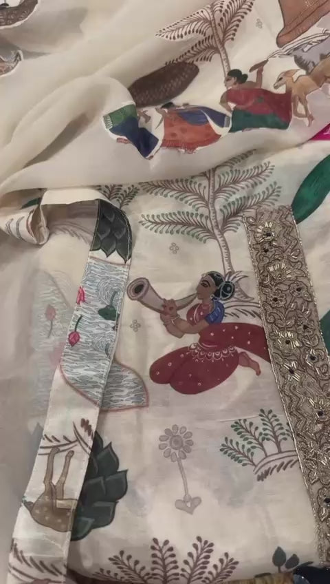 Pure Muslin with digital print with handwork neck panel with organza dupatta with appliqué work